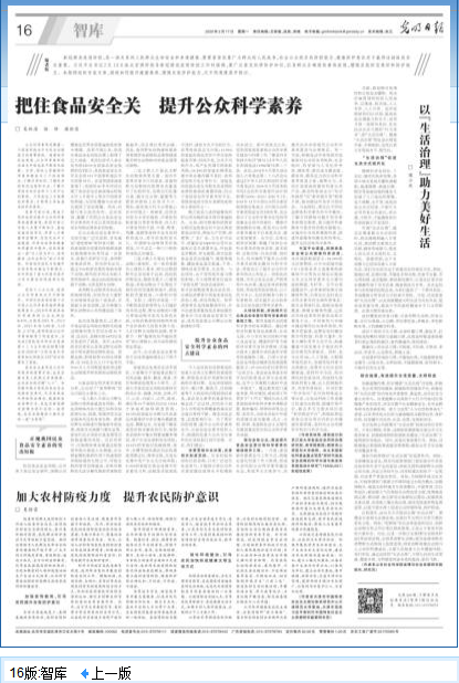 2020年2月17日, 《光明日报》第16版.智库刊发了公司吴林海、浦徐进教授等的研究成果《把住食品安全关 提升公众科学素养》一文。这是国家社科基金重点项目“新时代食品安全战略的科学内涵与制度体系框架设计研究”〔19AGL021〕阶段性成果之一。