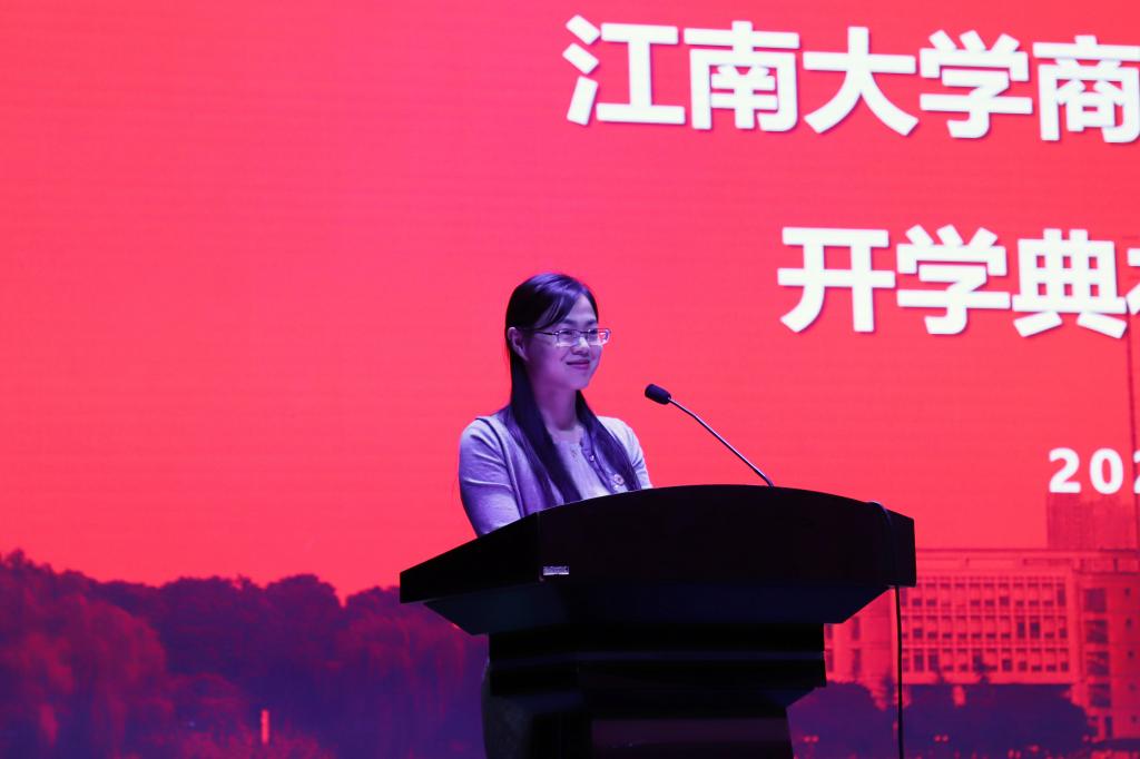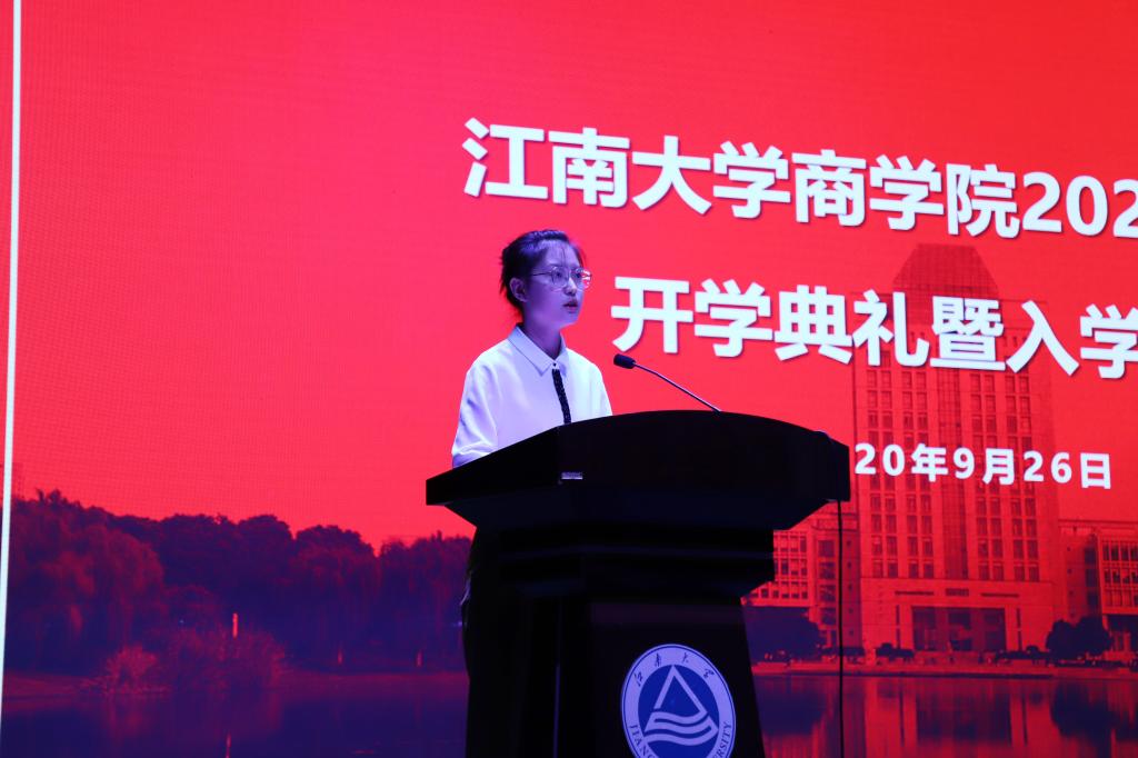 2020级会计三班张雅柔作为新生代表上台发言。毕业于衡水第一中学、曾获国家级荣誉,张雅柔展示了商院新人的决心与担当,讲述了习惯对于老员工活的重要性,希望每位同学都让努力、实践和优秀成为始终伴随自己的好习惯。