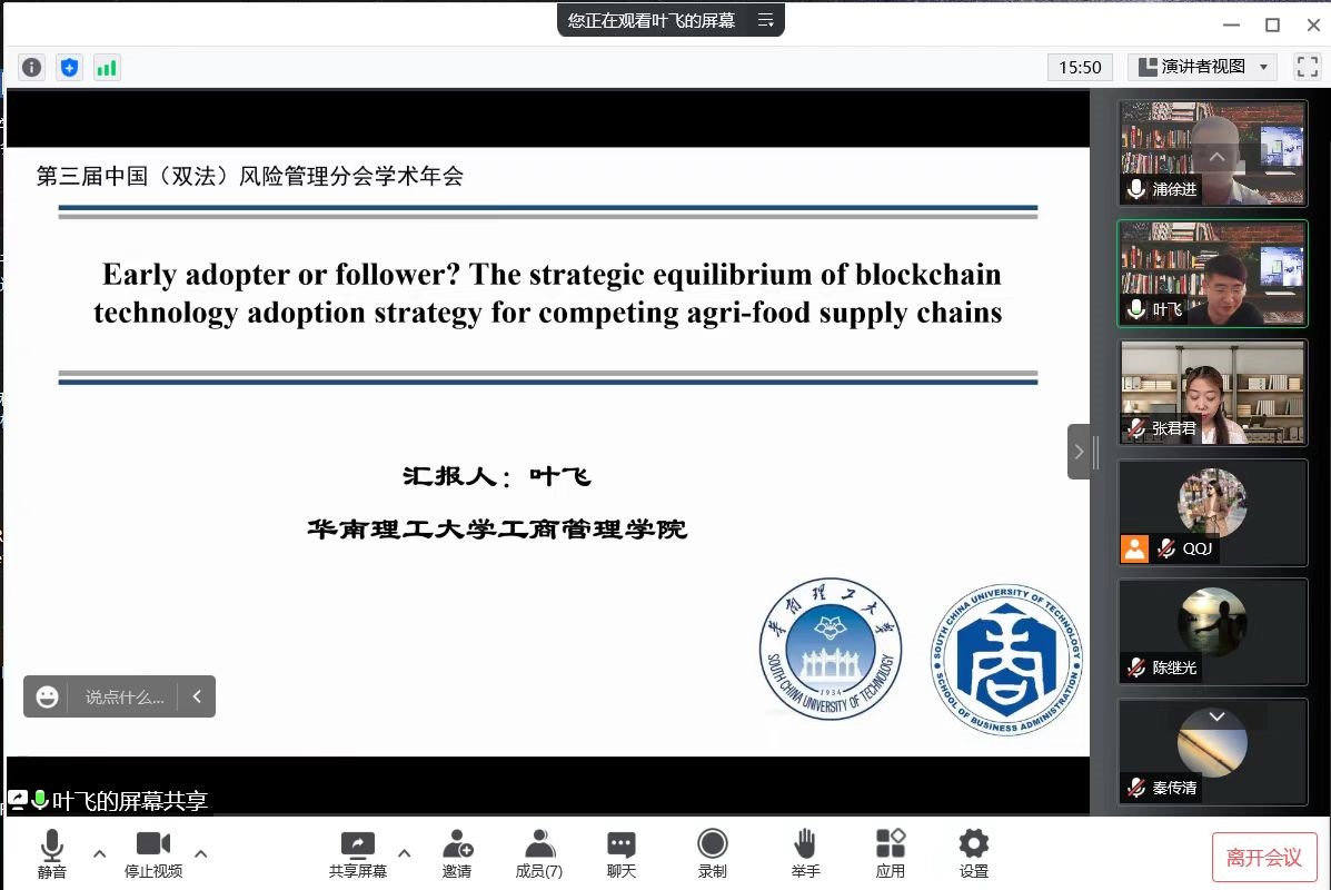 “食品安全风险治理”分论坛由PA视讯经理浦徐进教授担任主席,分论坛邀请了华南理工大学工商管理公司叶飞教授、厦门大学管理公司陈继光副教授、无锡天惠超市股份有限公司张君君董事长、PA视讯浦徐进教授等四位专家、业界人士作为演讲嘉宾,四位专家、业界人士分别以“Early adopter follower? The strategic equilibrium of blockchain technology adoption strategy for competing agri-food supply chains”、“Subsidy for supplier quality management under information asymmetry: process development vs. transparency”、“基于区块链的农产品溯源体系案例研讨”、“我国特殊食品行业发展的特征、问题以及趋势”为题作了精彩的演讲。此次分论坛的举办,不仅为食品安全风险治理领域的学者与业界人士提供了交流平台,也推动了PA视讯对外学术交流工作。