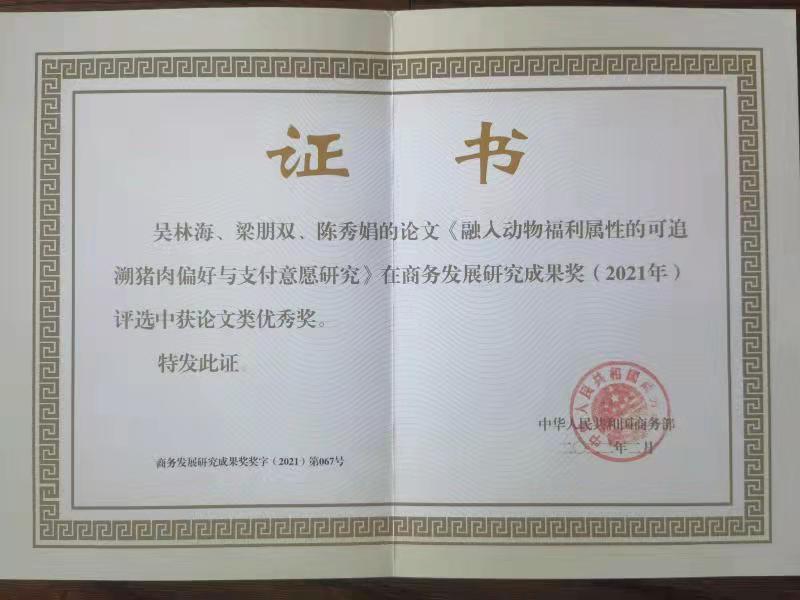 近日,公司在商务发展研究成果奖项方面传来佳讯。浦徐进教授的专著《供应链模式创新:线上线下融合之路》获得国家商务部商务发展研究成果奖(2021)论著类二等奖;吴林海教授的论文“融入动物福利属性的可追溯猪肉偏好与支付意愿研究”获论文类优秀奖
