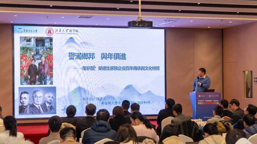 在主题分享环节,华南师范大学历史文化公司硕士生导师,中山大学(管理公司)中国家族企业研究中心研究员周孜正博士带来以“誉满乡邦 与年俱进—荣宗敬、荣德生家族企业百年传承与文化特质”为主题的研究分享。周博士从荣宗敬先生的家族企业文化、荣宗敬和荣鸿庆先生家族企业文化传承的方式及硕果,荣德生和荣毅仁先生家族企业文化传承的方式及硕果等三个维度切入,分析荣氏家族何以实现家族代代传承、家业百年长青。