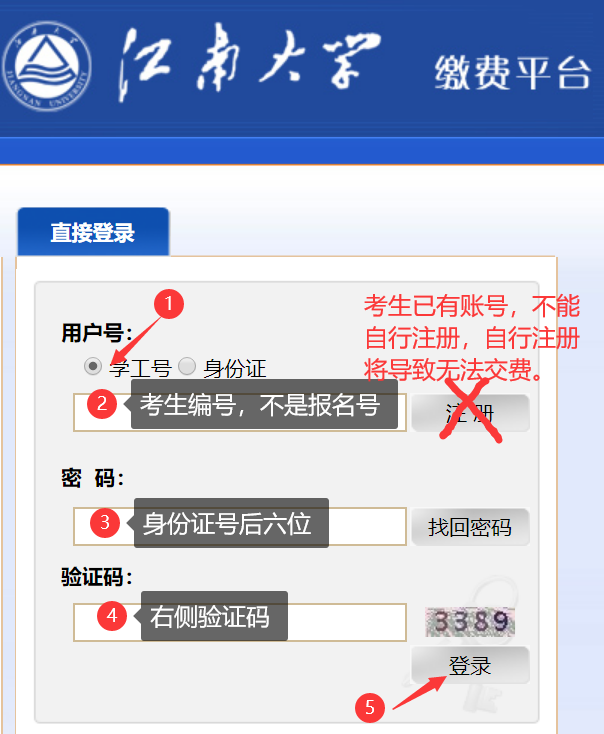 缴费说明:进入复试考生在公司规定的时间内登录“PA视讯缴费平台”交纳复试费用,复试收费标准:80元/生。缴费网址:http://pay.jiangnan.edu.cn/payment/。登录账号为准考证上的考生编号,登录密码为身份证后六位(友情提醒:考生账号已开通,切勿自行注册)。按照提示交费(使用网银),并打印或截图保存付费凭证。