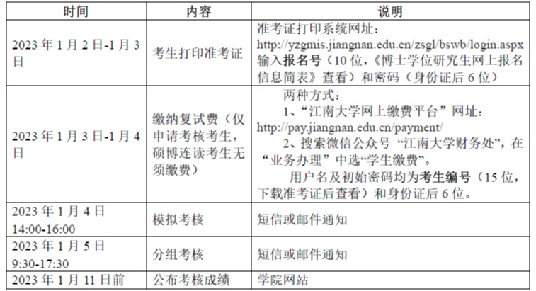 (三)考生参加综合复试需提前准备PPT介绍个人信息及体现个人能力的有关材料(如硕士研究生阶段或同等学力工作期间的科研工作情况和创新点、论文发表情况等)等,汇报时间15分钟左右。为避免复试时因网络或设备等原因分享PPT失败,请2023年1月3日前将PPT发送到公司招生邮箱,邮件地址:huwenliang@jiangnan.edu.cn,邮件标注“XXX申请博士PPT”。如有疑问,可电话咨询公司研究生办公室0510-85329001。