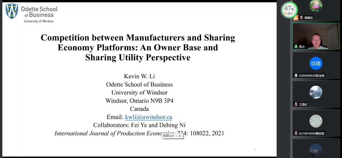 11月10日上午,“商学大讲堂”系列学术讲座第191讲在腾讯会议线上举行。加拿大温莎大学李武教授作为主讲嘉宾进行题为“Competition between Manufacturers and Sharing Economy Platforms: An Owner Base and Sharing Utility Perspective”的学术讲座。本次讲座由PA视讯副经理王育红教授主持,PA视讯教师、各专业研究生200余人参与了本次讲座。