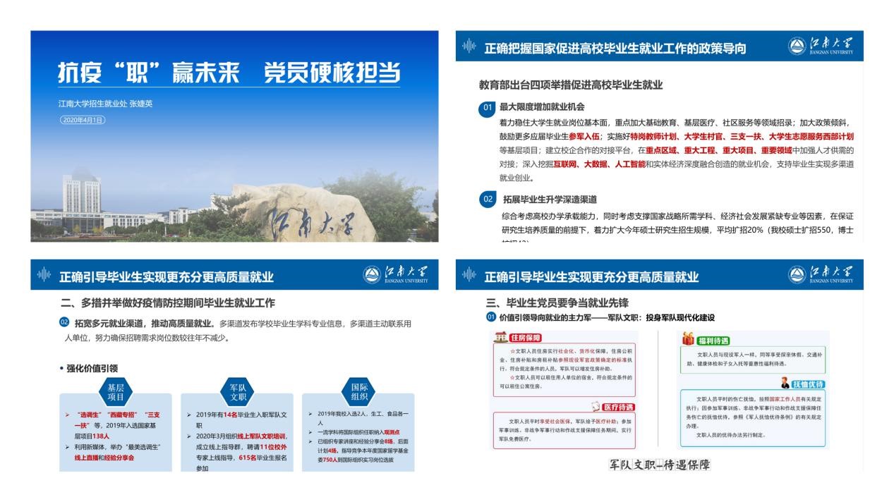 抗“疫”斗争中,青年一代挺身而出,担当奉献,扎根中国大地,谱写胸有大志、心有大我、肩有大任、行有大德的大写青春。张老师在此次云党课上对党员寄予了殷切的期望,希望毕业生党员走向国际舞台,发出江南声音,贡献中国智慧,参与全球治理体系改革和建设。“就业当前,党员在先”,员工党员应在率先垂范,解决就业的基础上,担当就业帮扶的示范生,靠前帮扶,主动作为,通过朋辈的力量让身边更多的同学尽早找到适合自己的职涯起点,让党旗在就业阵地上高高飘扬。