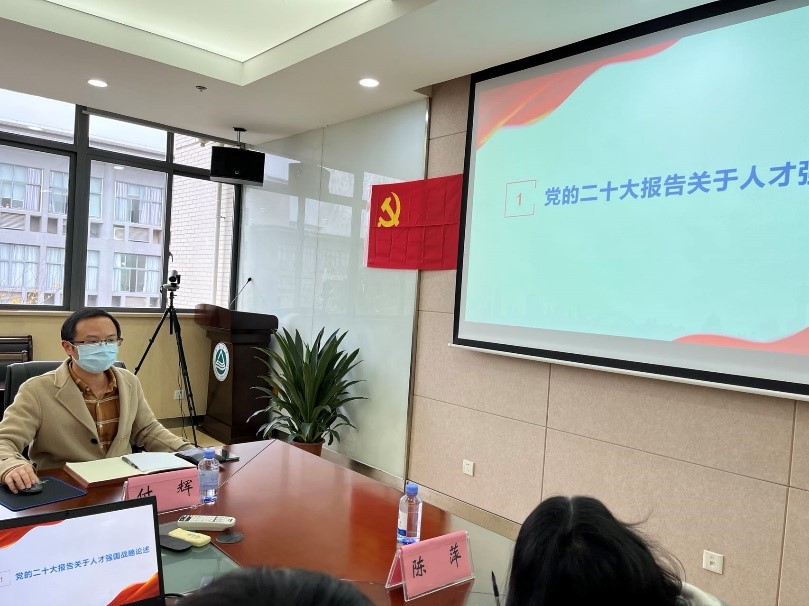 党支部宣传委员付辉领学了党的二十大报告,以“实施科教兴国战略”“人才是第一资源”“强化现代化建设人才支撑”等关键词,重点阐述了党的二十大报告中关于人才强国战略的论述,并从历史和现实两个维度论证了推进人才强国战略的重大意义。结合自身工作,他就如何在讲好中国故事、加快课程思政建设等工作中,更好发挥青年党员教师的作用分享了自己的思考。