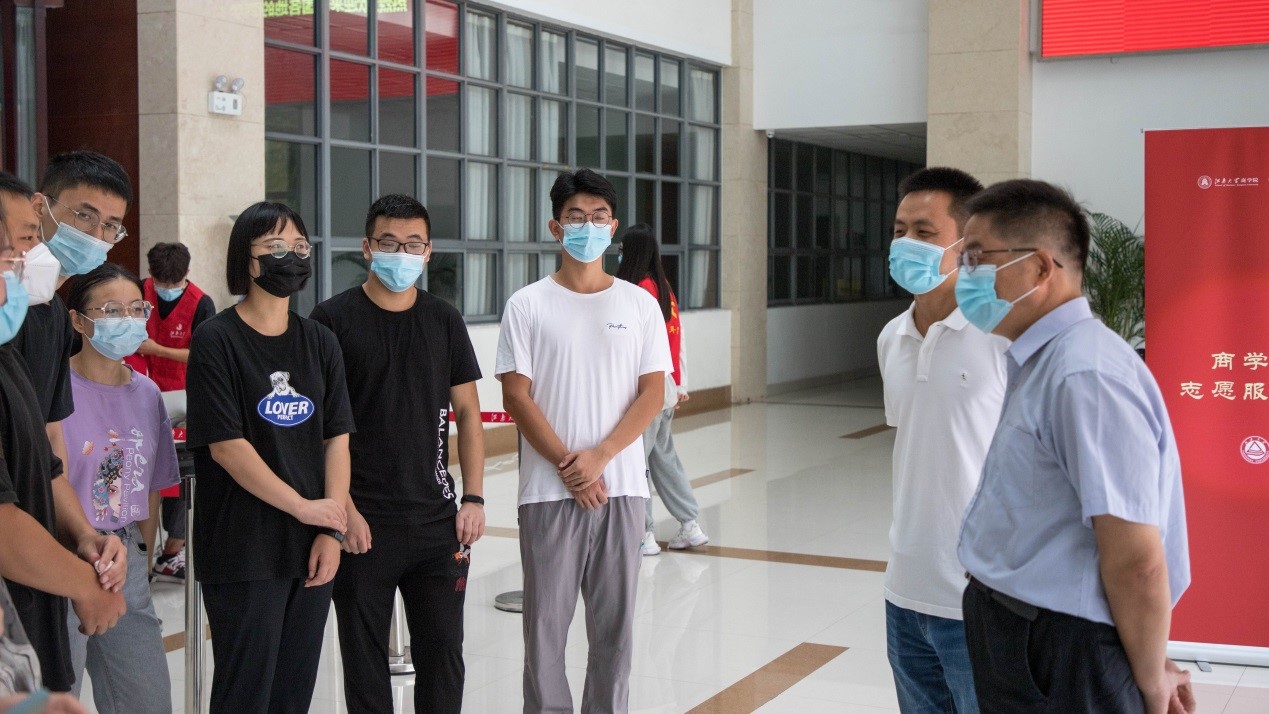在报到现场,新生辅导员与同学们耐心交流,为新生答疑解惑。新生们在志愿者的引导下完成体温监测,报到登记注册等。在杏园、梅园员工公寓,志愿者协助新生搬运行李,将员工行李运送至寝室。
