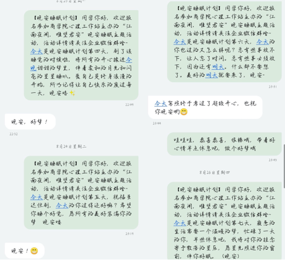 晚安睡眠计划由三个环节组成:发布每日睡前讨论话题,督促坚持早睡打卡,短信传递晚安祝福。招募的心理委员所担任的“晚安信使”就是祝福的传递者,他们发挥着整个活动的桥梁纽带作用,传递了朋辈互助的温情力量。工业2001心理委员任涛认为“担任信使,传递温暖与祝福是一件很有爱有温度的事情”;工商1902心理委员何若瑶表示“陌生人的晚安祝福,不仅温暖了手机那端接收短信的同学,也温暖了自己”。