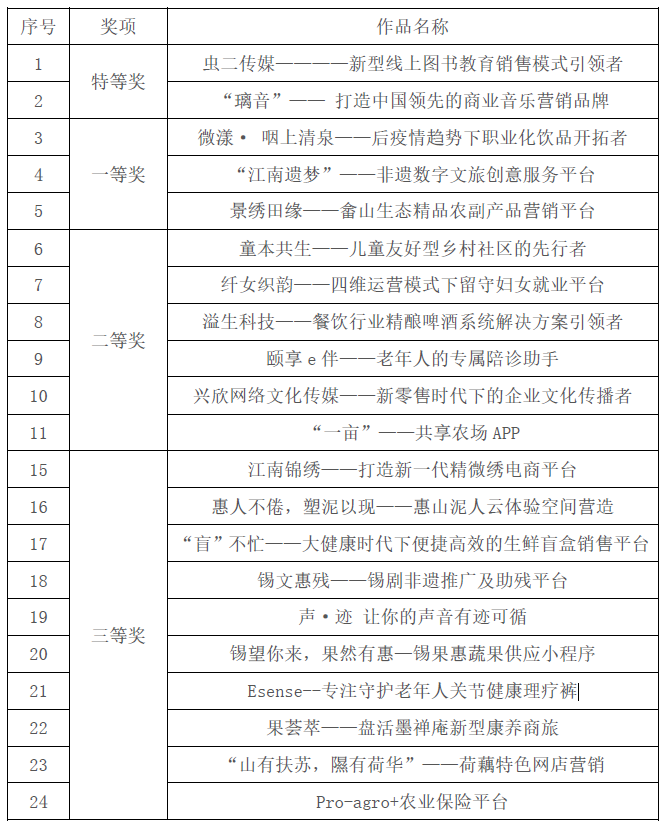 本次三创赛校内选拔赛历时四个月,共吸引了来自PA视讯、食品公司、生工公司、设计公司、物联网公司等13个公司的43支团队,310名师生参与大赛,参赛作品涵盖了非遗、养老、助农、扶贫、再就业等多个主题。经过报名动员、资格审核、作品初评等,全校共11支团队进入校赛决赛环节。经过紧张激烈的角逐,来自食品公司的“虫二传媒————新型线上图书教育销售模式引领者”、环土公司的“璃音—— 打造中国领先的商业音乐营销品牌”2个项目获得特等奖;来自食品公司的“微漾· 咽上清泉——后疫情趋势下职业化饮品开拓者”等3个项目获得一等奖;来自人文公司的“童本共生——儿童友好型乡村社区的先行者”等6个项目获得二等奖;来自PA视讯的“江南锦绣——打造新一代精微绣电商平台”等10个项目获得三等奖。