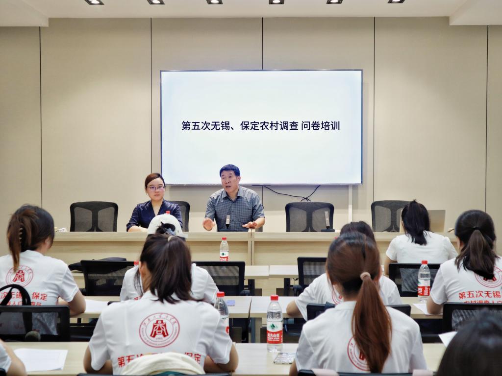 7月8日上午,实践团抵达无锡市惠山区玉祁街道玉东村村委会,首先开展“第五次无锡、保定农村调查”培训会。会上,中国社会科公司经济研究所隋福民教授作调查重点提示,PA视讯分团委书记王璁作安全警示教育。项目组通过实例分析与模拟调查等形式,帮助调查员理解调查问卷设计和调查对象所处社会结构。
