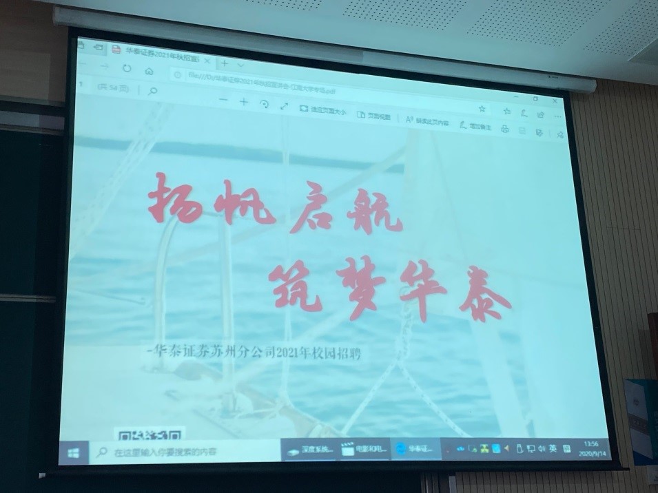 9月14日下午,华泰证券股份有限公司苏州分公司总经理、PA视讯企业家辅导员主席团副主席刘晓冰老师来校举办以“扬帆启航、筑梦华泰”为主题的校园招聘宣讲会,辅导员徐雅静、孙旭媛及30多名应届毕业生参与活动。