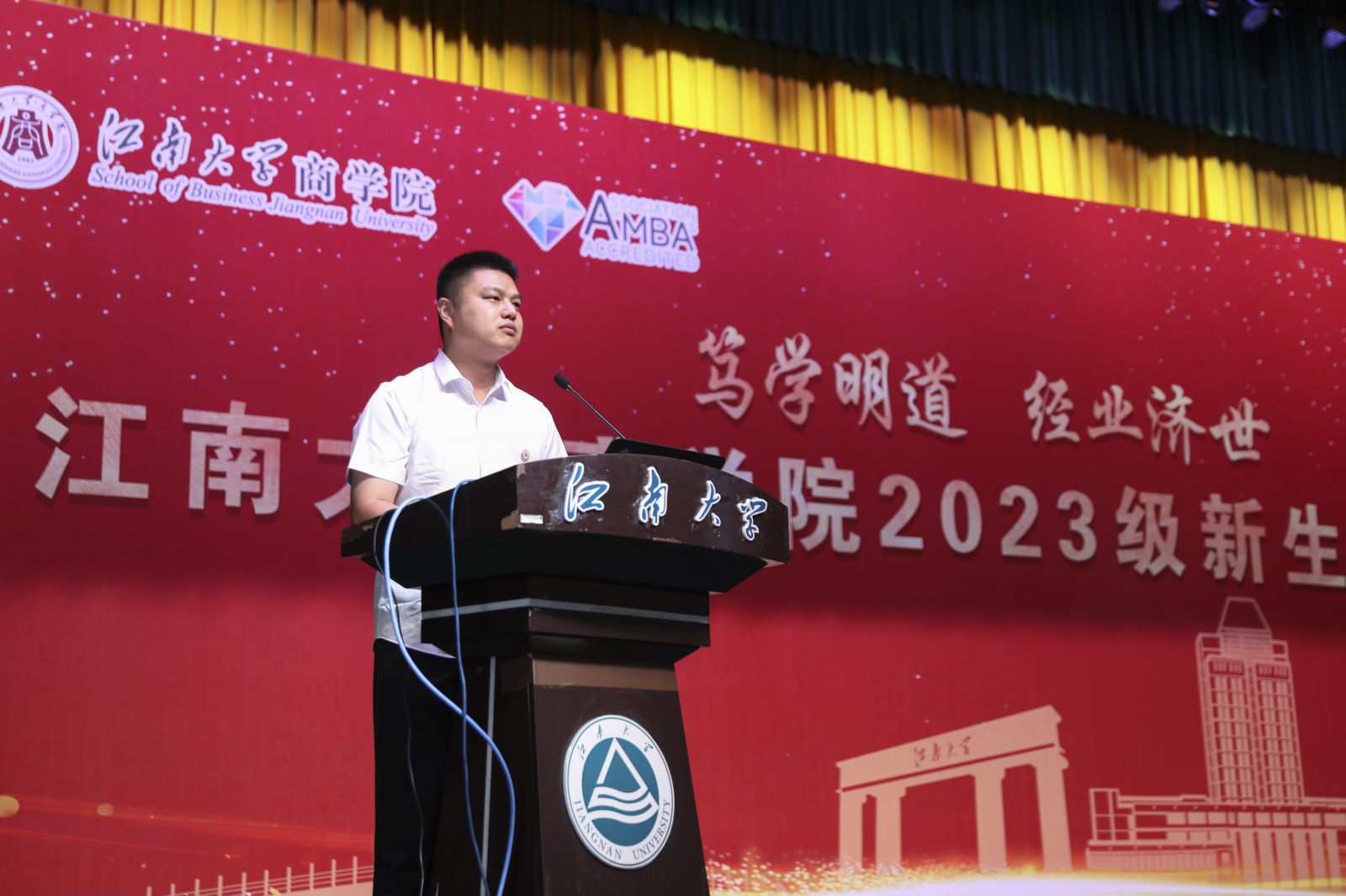 MBA教育中心研究生新生代表易文斌同学向同学们分享了备考过程的辛苦不易以及考上后的骄傲自豪,而后他代表MBA/MEM的全体新生向老师们做出承诺:“我们将时刻牢记我们是一名江南商院人,以身作则,认真学习,努力实践,为我们MBA/MEM项目的发展、为母校美好的明天、为建设科技强国做出自己的贡献。”