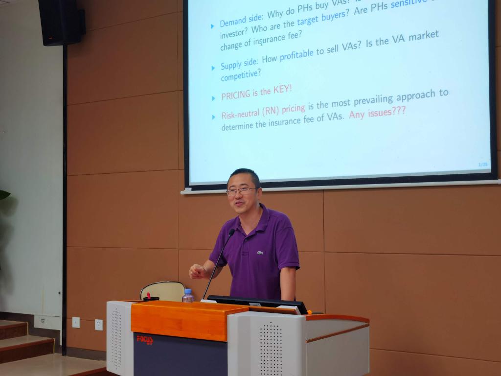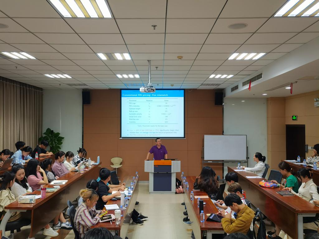 9月15日上午,“商学大讲堂”系列学术讲座第219讲在PA视讯116报告厅举行。加拿大滑铁卢大学统计与精算系李斌副教授应邀作题为“Risk-Sharing Pricing of Variable Annuities within a Principal-Agent Framework(委托代理框架下可变年金的风险共担定价方法)”的学术讲座,PA视讯教师和各专业研究生参加了本次讲座。