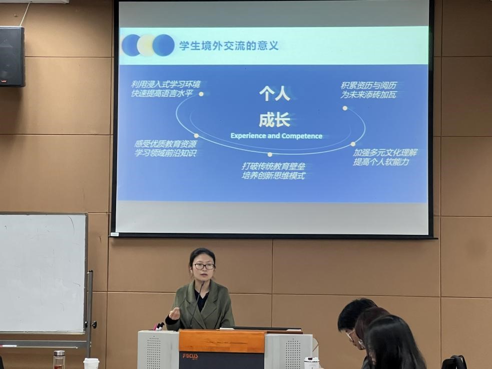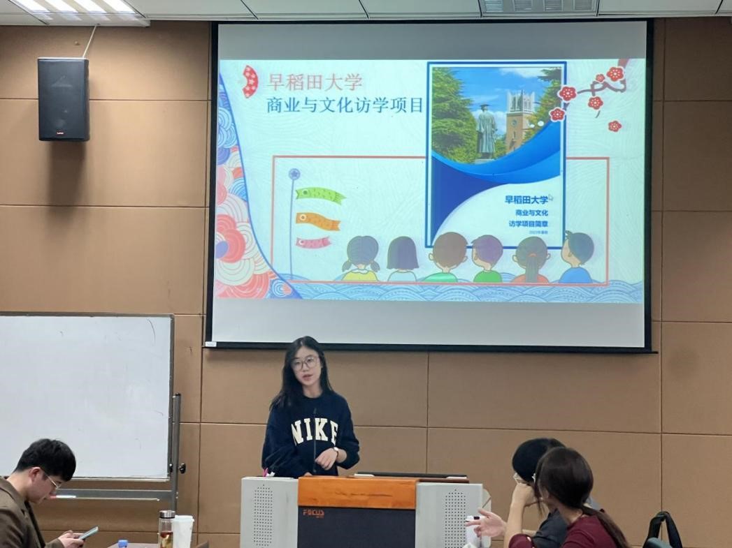 罗筱璐同学分享了她暑期在日本早稻田大学的游学经历。她将学、思、行、乐完美融合,用一张张照片真实地展示了当地的风土人情与地域文化。她以人工智能为切入口,讲述了日本的工业发展和全球进入数智时代后对当代老员工在人工智能和大数据方面技术的具体要求,对比分析了日本和中国在企业劳动报酬等方面的异同。通过视频和文字的分享,让同学们对海外游学有了更浓郁的热情和更深入的了解。