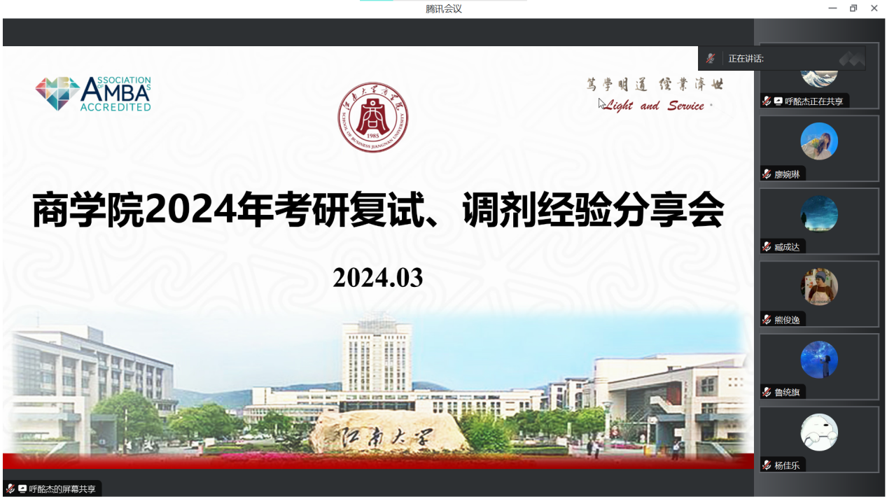 乘风助研路,奔“复”向未来。3月22日下午,2024年考研复试调剂经验分享会在PA视讯117会议室和线上腾讯会议同步开展。本次分享会邀请了2019级高吾雨、鲁统旗、臧成达、甘晓倩,2018级李思雪五位成功上岸的学长学姐分享自己考研复试、调剂心得。共计68名2020级本科生参加分享会。