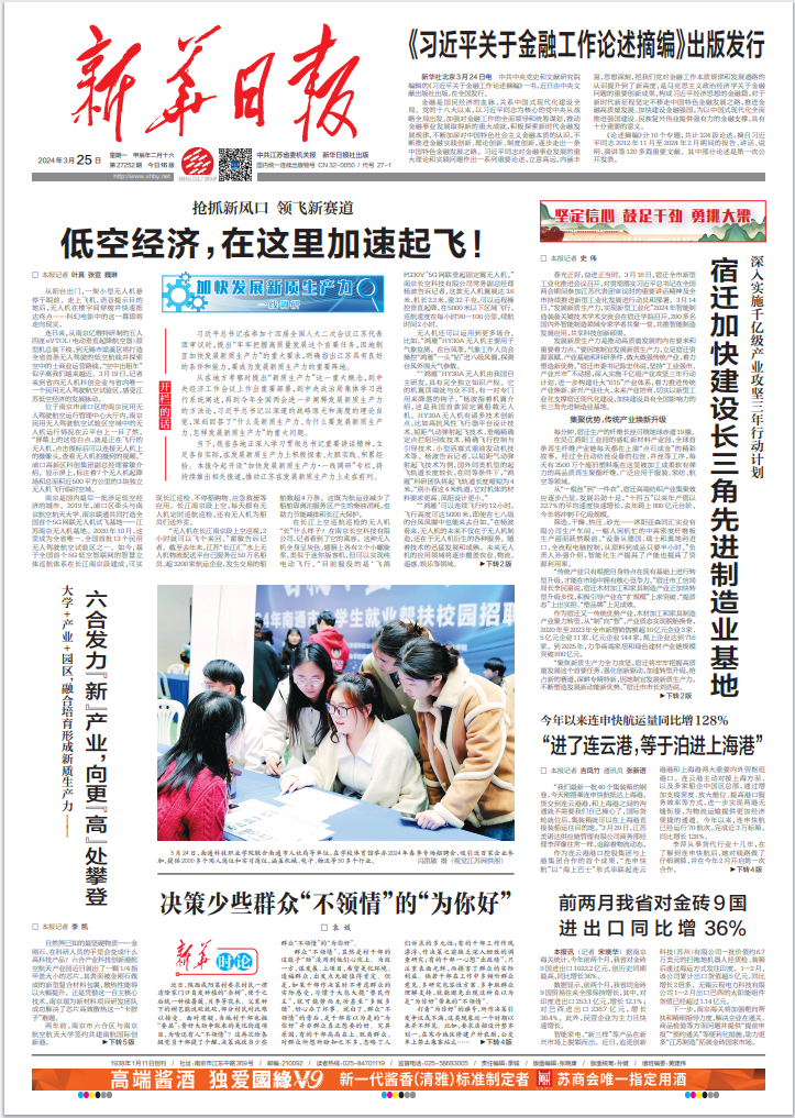 《新华日报》2024年3月25日头版“加快发展新质生产力·一线调研”专栏,刊登“低空经济,在这里加速起飞”文章,抢抓新风口,领飞新赛道。公司浦徐进教授接受《新华日报》专访并发表观点。