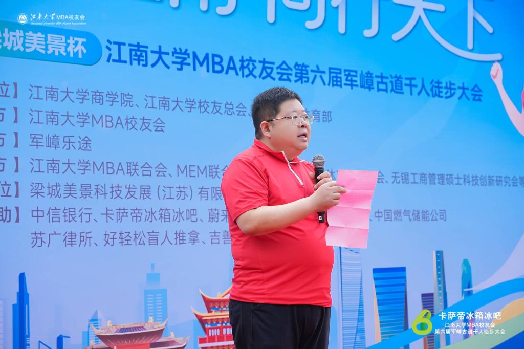 上午8时许,徒步大会开幕式正式开始,MBA2023级员工、MBA联合会副主席李岩主持开幕式。PA视讯公司党委书记刘长青致辞,刘书记表示在新中国成立75周年和奥运年举行徒步大会意义非凡,希望队员们在活动中以勇往直前、奋发向上、顽强拼搏的意志品质精神,在徒步锻炼中享受乐趣、增强体质、健全人格、锤炼品性。冠名赞助商梁城美景科技发展(江苏)有限公司品牌营销部崔鹏经理、连续两年支持活动的赞助商代表中信银行无锡分行副行长蔡映霞女士分别登台致辞。