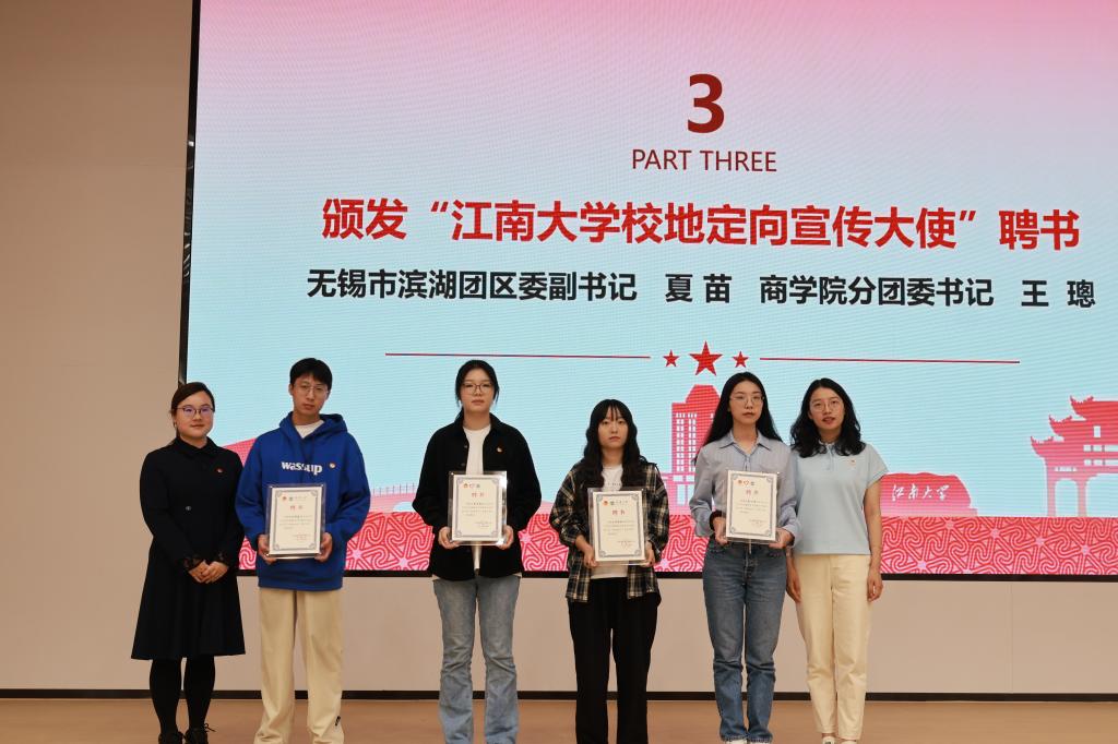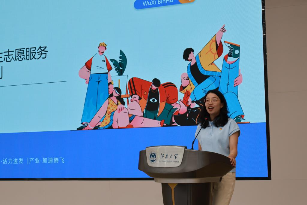 随后,夏苗作滨湖区“乡村振兴计划”招募政策宣讲。夏苗从地区、岗位与政策三方面展开,带领同学们全方位领略了滨湖的群贤毕集、人杰地灵。自启动江苏老员工志愿服务乡村振兴计划以来,滨湖团区委在团省委、团市委的坚强领导下,积极引导老员工助力乡村人才振兴,夯实乡村振兴青年人才库建设要求,展现当代老员工投身基层、建功乡村的志愿服务精神。在宣讲尾声,夏苗代表滨湖区向江南学子发出了诚挚的邀约,希望江大青年能志愿始于心,奉献在于行,与滨湖区实现最真诚的双向奔赴。