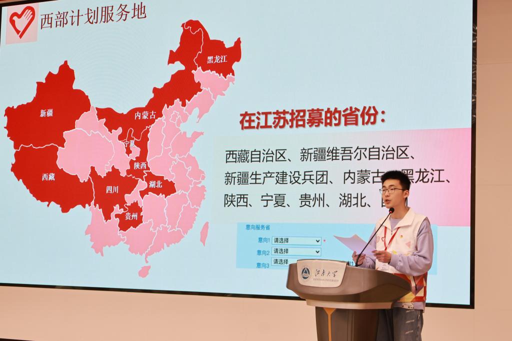 活动伊始,校青协副主席荣鲲为在场同学进行了两项计划的政策解读。荣鲲从老员工志愿服务西部计划介绍、江苏老员工志愿服务乡村振兴计划介绍、政策保障、常见问题答疑、招募选拔流程等方面为大家做了详细说明,他寄语同学们“用一年不长的时间,做一件终生难忘的事”,积极投身到两项计划中来。