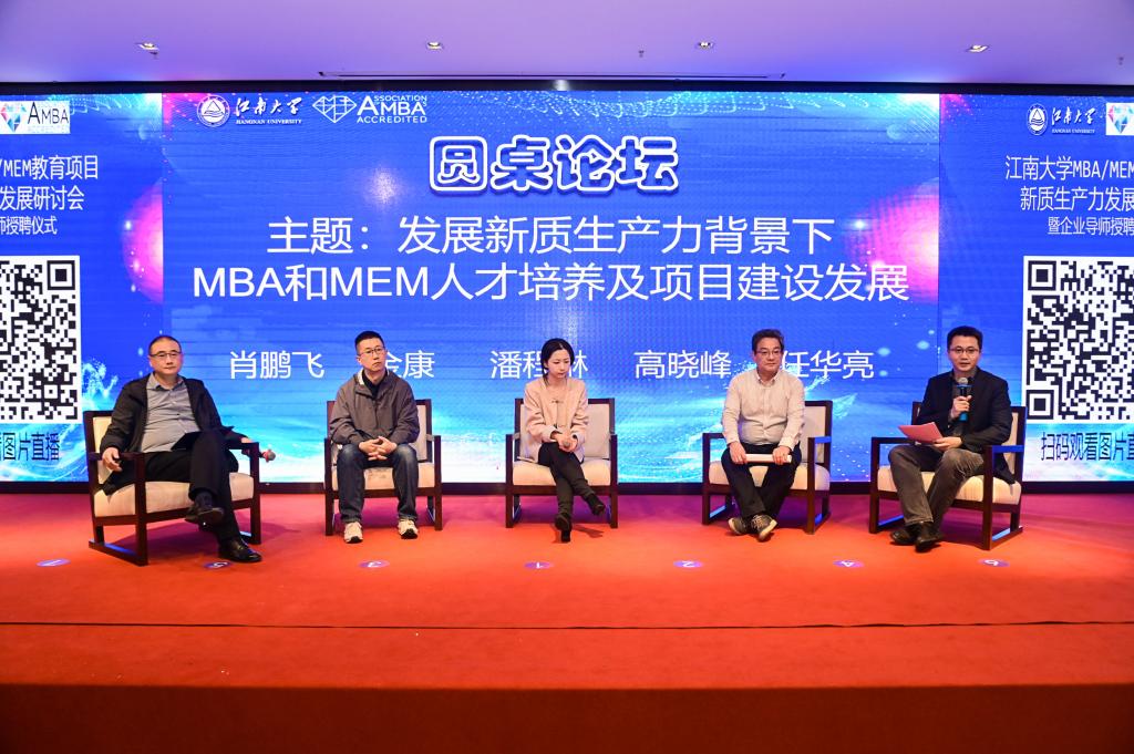 圆桌论坛环节,由PA视讯副教授、MBA项目学术主任任华亮老师担任主持,德地氏流程系统设备(无锡)公司CFO肖鹏飞,上海形家广告设计有限公司董事长金康,某国际证券董事潘程琳,无锡王道科技有限公司董事长、CEO高晓峰等四位企业导师担任分享嘉宾,大家共同了探讨新质生产力背景下MBA和MEM人才培养及项目建设发展,大家提出了对新质生产力的理解以及与教育项目培养建设融合发展的思考分享。