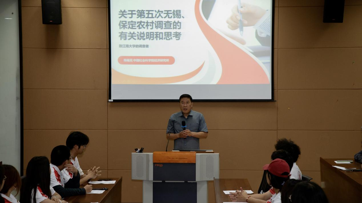 之后,隋福民作题为“关于第五次无锡保定农村调查的有关说明和思考”专题培训。他从“什么是无锡、保定农村调查?”“为什么要做第五次无锡、保定农村调查?”“目前的进展和未来的任务”“应该做什么样的准备?”四个方面深入浅出地讲解了无锡、保定农村调查的起源历史、发展进程、调研难点以及期望要求,为在场师生提供了宝贵的指导和启示。