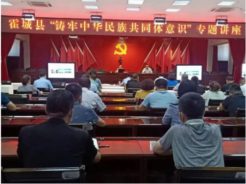 揭牌结束后,PA视讯副教授、市校共建铸牢中华民族共同体意识研究基地副主任兼秘书长、无锡市民族团结促进会常务副会长沈伟晔采用线上、线下相结合的方式为霍城县500余名干部做了题为“铸牢中华民族共同体意识理论与实践”的专题讲座。