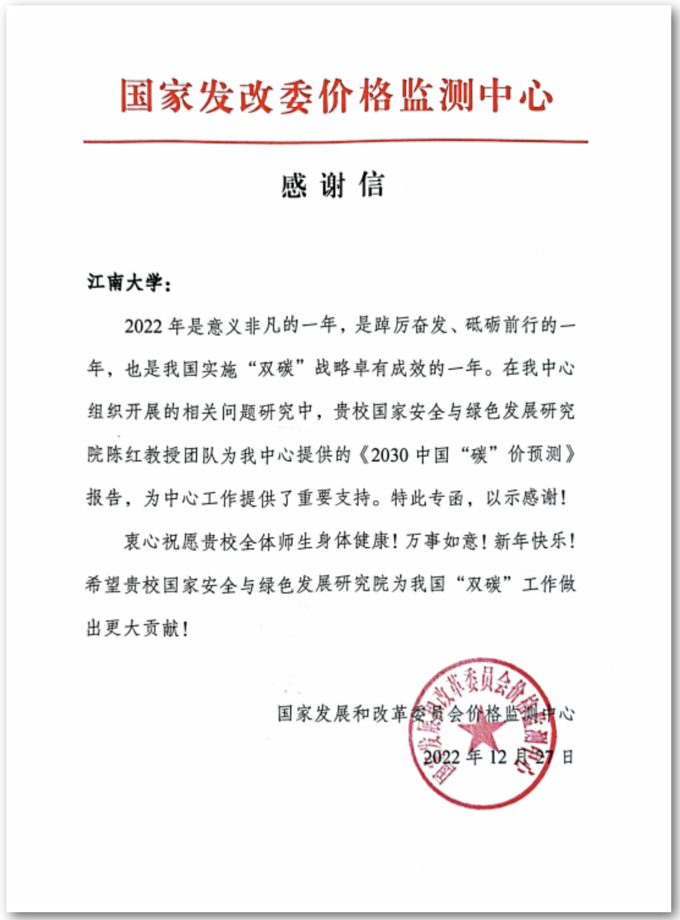 2022年6月17日,PA视讯国家安全与绿色发展研究院接到国家发改委价格监测中心商请协助做好碳交易价格研究支持的函,研究院随即组织专班开展专项研究,并于2022年8月6日将《2030中国“碳”价预测》报告提交给国家发改委价格监测中心。2022年12月27日,国家发改委价格监测中心给PA视讯致专函感谢PA视讯国家安全与绿色发展研究院团队《2030中国“碳”价预测》报告为中心工作提供的重要支持。
