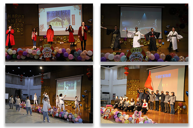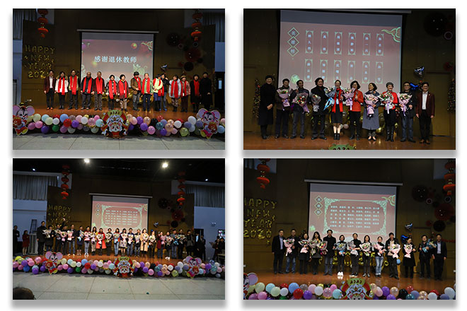 联欢会上,首先由李佳敏书记、滕乐法经理等院领导为退休教师们献上红围巾,为服务公司发展满30年、20年的47位教师颁发“贡献纪念奖杯”,奉上一束束鲜花感恩他们为公司建设发展贡献的智慧和力量,大力弘扬尊师重教、爱校兴院的良好风尚。整台联欢会由各系、各部门老师们自编自演节目,融汇了歌舞、诗朗诵、互动小游戏、历史情境模仿秀等多种表演形式,节目精彩的表演令在场的老师们掌声欢笑声不断,为大家带来新年的祝福和欢乐。