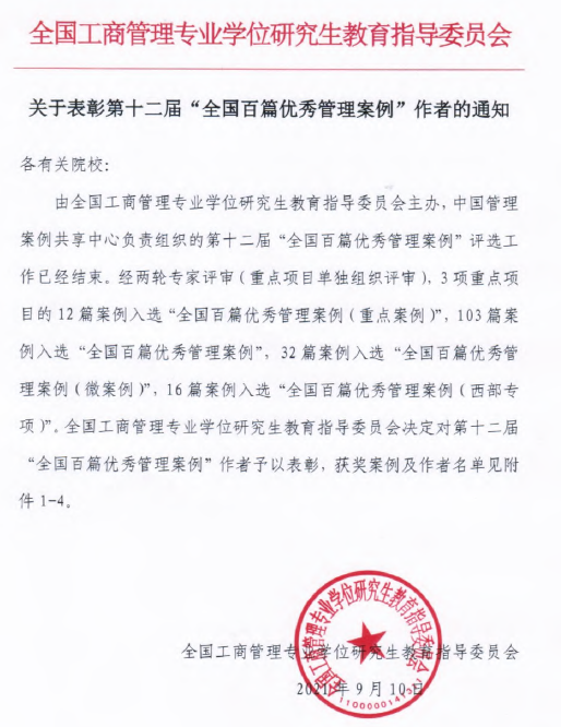 “全国百篇优秀管理案例”是全国工商管理案例领域的最高奖项,本届评选于2021年3月24日启动,全国共有147所院校的1088项案例投稿, 公司MBA教育中心共提交了7篇原创案例,提交数量创历届新高。近五年,公司共有6篇案例获得“全国百篇优秀管理案例”,8篇案例入选“中国管理案例共享中心案例库”,1篇案例入选“中国工商管理国际案例库”。