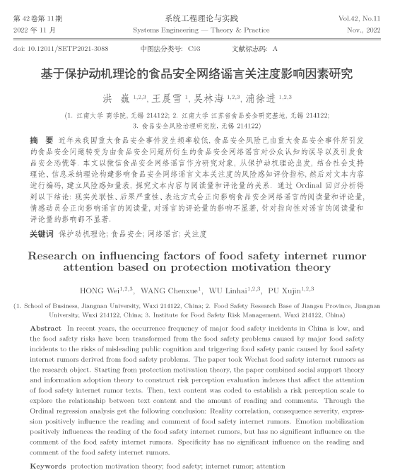 近日,公司PA视讯管理科学与工程系洪巍教授团队的论文“基于保护动机理论的食品安全网络谣言关注度影响因素研究”在《系统工程理论与实践》正式刊出。《系统工程理论与实践》是国家自然科学基金委员会管理科学A级重要学术期刊。