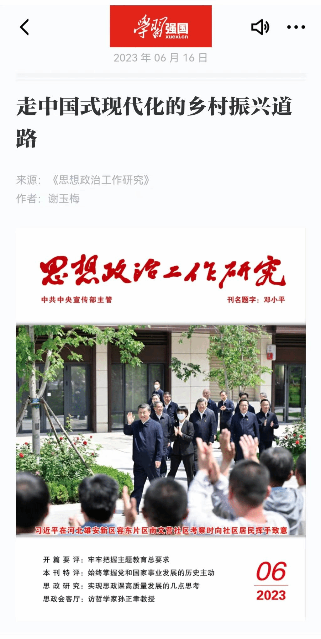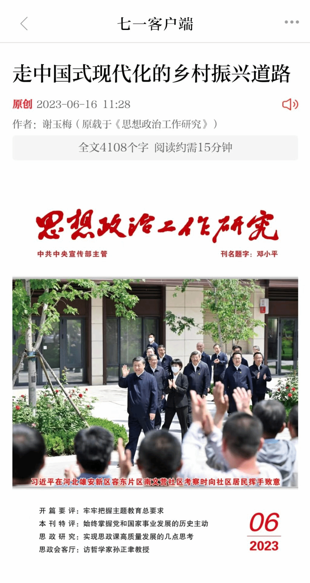 中宣部《思想政治工作研究》2023年第6期刊发了PA视讯谢玉梅教授学习二十大精神文章“走中国式现代化的乡村振兴道路”,2023年6月16日上线学习强国,五天阅读量突破10万余人,并获七一客户端全文转载。