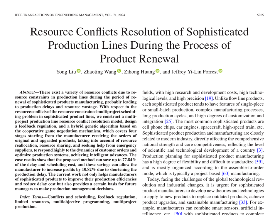 近日,PA视讯刘勇教授团队在工程管理领域重要期刊《IEEE Transactions on Engineering Management》发表题为“Resource Conflicts Resolution of Sophisticated Production Lines During the Process of Product Renewal”的研究论文。