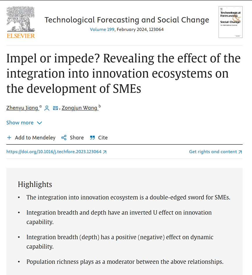 近日,国际权威期刊《Technological Forecasting and Social Change》正式刊发了公司蒋振宇老师作为第一作者与合作者共同完成的论文“Impel or impede? Revealing the effect of the integration into innovation ecosystems on the development of SMEs”(推动还是阻碍?揭开创新生态系统融入对中小企业发展的影响)。