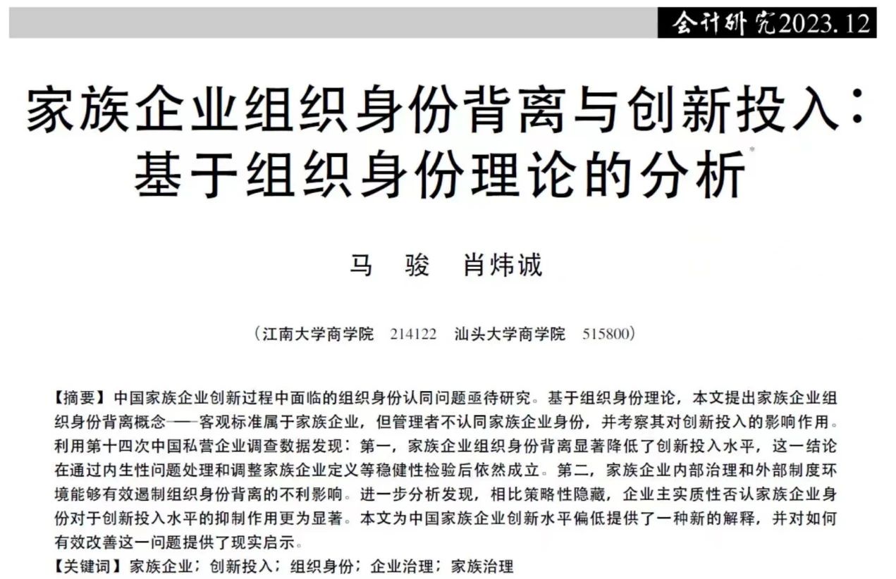 近日,公司马骏副教授与合作者共同完成的论文“家族企业组织身份背离与创新投入:基于组织身份理论的分析”在《会计研究》期刊正式刊出。《会计研究》杂志是财政部主管、中国会计学会主办的国家一级学术期刊,是国家自然科学基金委员会确定的管理科学A类重要期刊,是CSSCI来源期刊中唯一的会计类学术期刊,是中文会计学顶级期刊,也是江苏省哲学社会科学规划办公室认定的权威刊物。