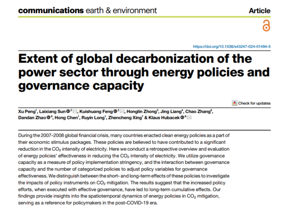 近日,PA视讯青年教师彭旭在全球碳减排中的气候治理能力及其政策效应研究方面取得重要突破进展,相关研究成果以“Extent of global decarbonization of the power sector through energy policies and governance capacit”为题于6月13日刊发于《自然》系列子刊《通讯-地球与环境》(Communications Earth & Environment)。《通讯-地球与环境》旨在发表地球科学、行星科学以及环境科学领域能够带来新的见解以及研究领域内重大进展的科学论文。目前该刊物学科大类和小类划分均为中科院1区Top期刊。目前该论文也是全国范围内以PA视讯或经管公司为第一单位在此刊物的首次发表,标志PA视讯在此领域内取得重要突破性进展。