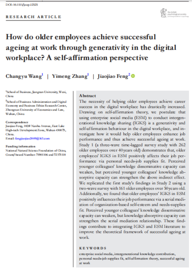 近期,国际权威期刊《Journal of Occupational and Organizational Psychology》在线发表了公司汪长玉教授、2022级硕士研究生张奕萌和中南财经政法大学冯娇娇副教授(通讯作者)共同完成的论文“How do older employees achieve successful ageing at work through generativity in the digital workplace? A self-affirmation perspective”。汪长玉教授为本研究的第一作者。
