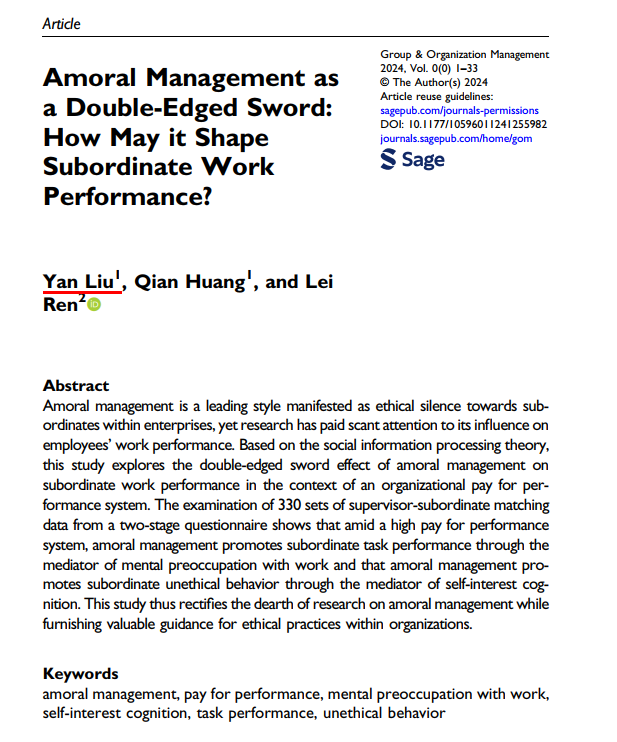 近日,公司刘燕教授与研究生黄倩以及无锡公司任磊合作的论文“Amoral Management as a Double-Edged Sword: How May it Shape Subordinate Work Performance?”在管理学领域期刊《Group&Organization Management》正式刊出。《Group&Organization Management》是SSCI检索期刊,影响因子4.0,中科院二区,ABS三星级期刊。