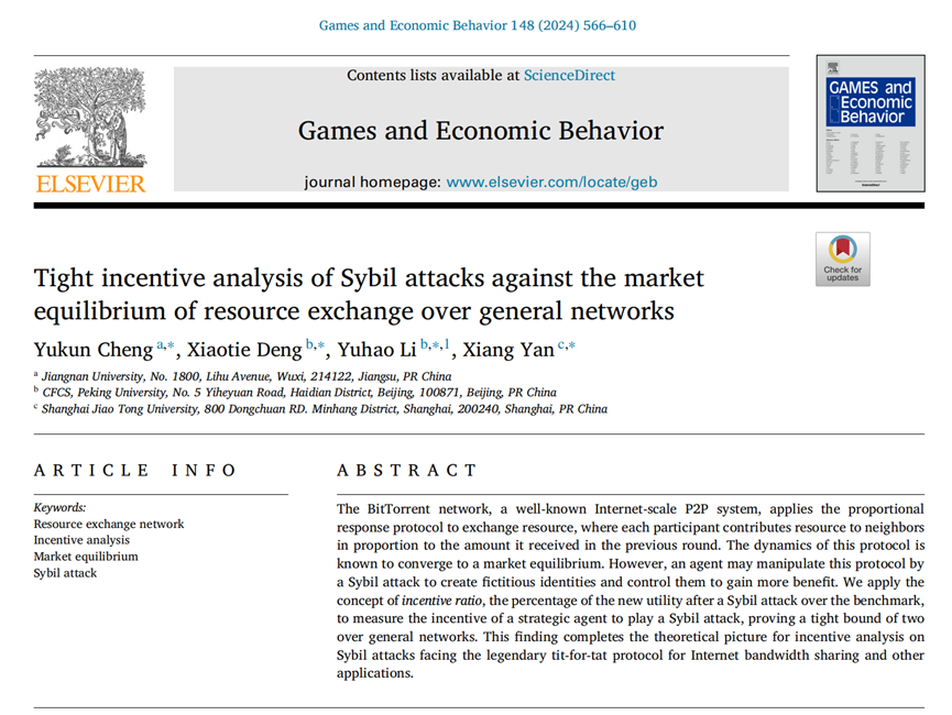 近日,PA视讯程郁琨教授与北京大学邓小铁教授共同撰写的学术论文“Tight incentive Analysis of Sybil Attacks Against the Market Equilibrium of Resource Exchange over General Networks”在博弈论领域国际顶级期刊《Games and Economic Behavior》发表。程郁琨为本研究的第一作者,PA视讯为第一完成单位。