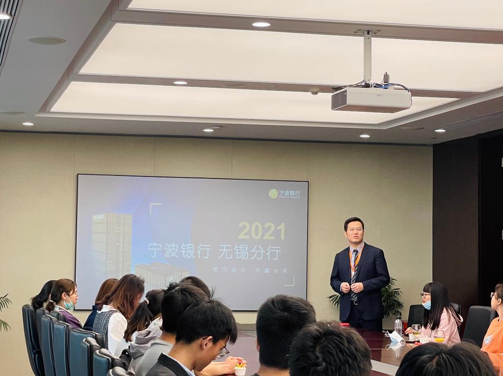 活动伊始,潘老师带领大家在宁波银行无锡分行进行了参观,并为大家介绍了宁波银行员工在衣食住行方面的具体情况。同学们也近距离了解到银行职员的工作环境与状态。参观结束后,大家来到了会议室,潘老师就宁波银行的发展现状以及招聘条件进行了简单的介绍。