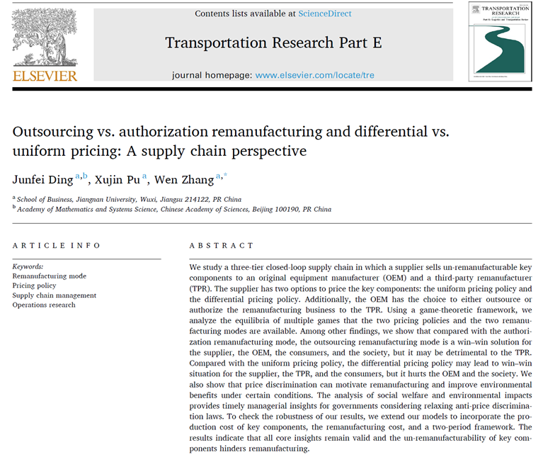 近日,国际权威期刊《Transportation Research Part E: Logistics and Transportation Review》正式刊发了公司丁军飞副教授、浦徐进教授和张文副教授共同完成的论文“Outsourcing vs. authorization remanufacturing and differential vs. uniform pricing: A supply chain perspective”。