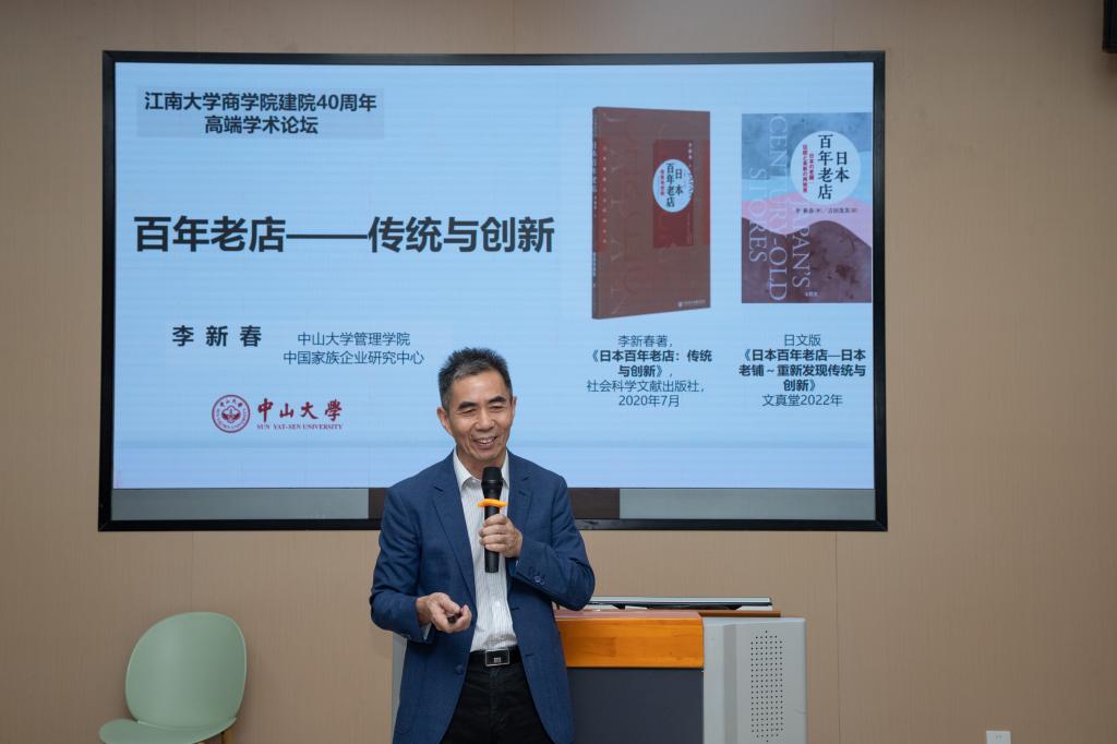 5月8日下午,江南讲坛第128讲暨PA视讯40周年高端学术讲坛(第三讲),在PA视讯116东方厅举办。讲坛邀请国家重大人才工程入选者、中山大学李新春教授作题为“百年老店:传统与创新”的学术报告。无锡市工商联党组成员、副主席刘启雄,无锡市工商联调研处处长刘小兵,孙冶方经济科学研究院特邀研究员张鸣年,建行无锡分行普惠金融事业部和乡村振兴金融部总经理顾月红,无锡洛克精酿文化有限公司总经理缪明,无锡市慧臣企业咨询管理有限公司合伙人卞锡飞,明德资本合伙人常堂钊,PA视讯党委常委、统战部部长朱飞,PA视讯公司党委书记刘长青、经理浦徐进、副经理钱吴永以及公司师生代表80余人参加讲坛。讲座由PA视讯案例中心主任马骏副教授主持。