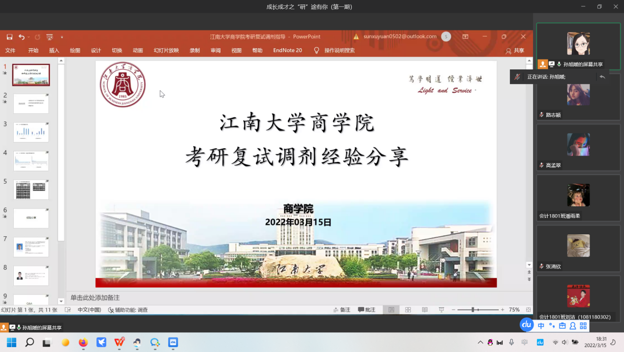 3月17日下午,第二期分享会在PA视讯304和企业微信线上同步开展。成功考研至本校应用经济学的余姝琼学姐从“考研复试流程”、“注意事项”及“联系导师”三方面,分别从自我介绍、英文翻译、专业课准备、仪表礼仪等角度分享自己的建议及心得。成功调剂至南京审计大学国际商务专业的陈芳学姐就调剂流程、院校选择、复试准备及心态调整等方面做出讲解,并主要分享了不同地区调剂院校的选择以及调剂信息的获取途径。同学们积极提问,分享嘉宾耐心解答,并希望考生们结合自身情况,认真把握机会,争取顺利上岸!