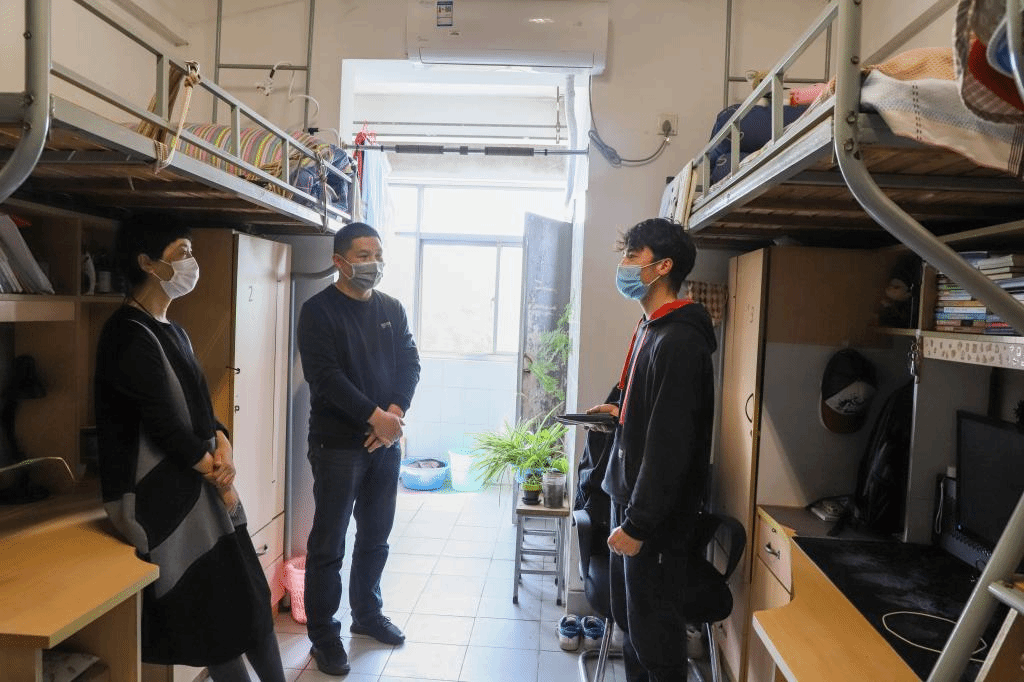 走访宿舍中,院领导与同学们展开亲切交流,详细询问了返校员工目前的身体状况、口罩等防疫物资的准备情况,叮嘱同学们在返校之后要继续重视个人防护,注意身体健康,保持良好的学习生活规律,用好时间充实自己。