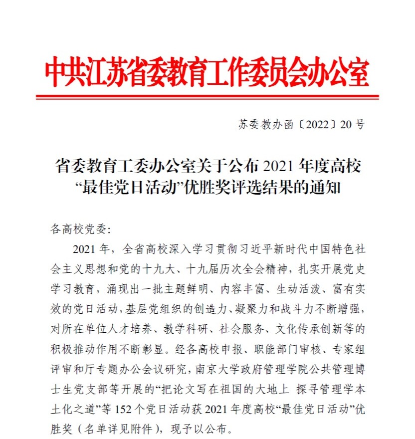 日前,江苏省委教育工委办公室下发了《关于公布2021年度高校“最佳党日活动”优胜奖评选结果的通知》,公司党委组织开展的《老少携手学党史,民族团结育新人》活动获评全省高校“最佳党日活动”优胜奖。